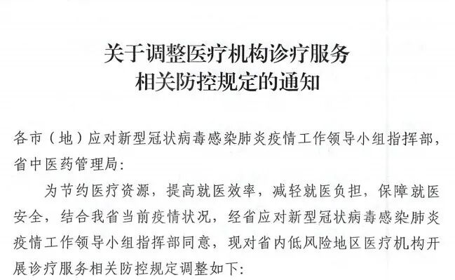日前,省應(yīng)對新冠肺炎疫情工作領(lǐng)導(dǎo)小組指揮部發(fā)出通知:為節(jié)約醫(yī)療資源,提高就醫(yī)效率,減輕就醫(yī)負(fù)擔(dān),保障就醫(yī)安全,結(jié)合我省當(dāng)前疫情狀況,對省內(nèi)低風(fēng)險(xiǎn)地區(qū)醫(yī)療機(jī)構(gòu)開展診療服務(wù)相關(guān)防控規(guī)定做出調(diào)整,具體內(nèi)容如下: