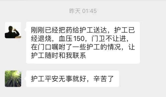 凌晨01:25,辛鑫與科室醫(yī)護(hù)人員協(xié)力配合協(xié)調(diào)一間單間,為護(hù)理員提供休息場(chǎng)所。辛鑫就近采購(gòu)感冒藥、退燒藥等藥品送到了護(hù)理員手上。
