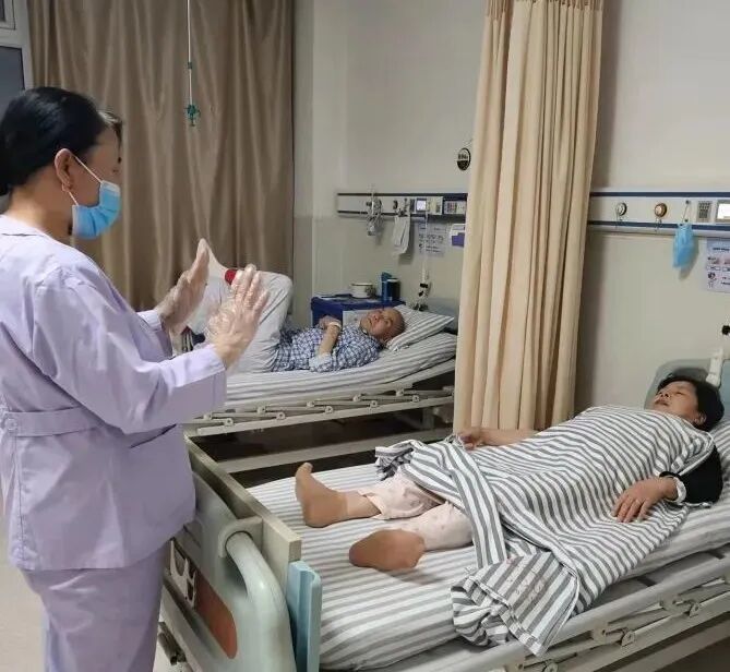 護(hù)理人員深感老人在陌生病房的焦慮與不安,她們每天通過聊天的方式幫助老人排解住院的心里壓力,還幫助老人操作手機(jī)與家屬視頻,減輕患者心理壓力。她們還會(huì)和老人玩互動(dòng)游戲,教老人活動(dòng)手腳關(guān)節(jié)。