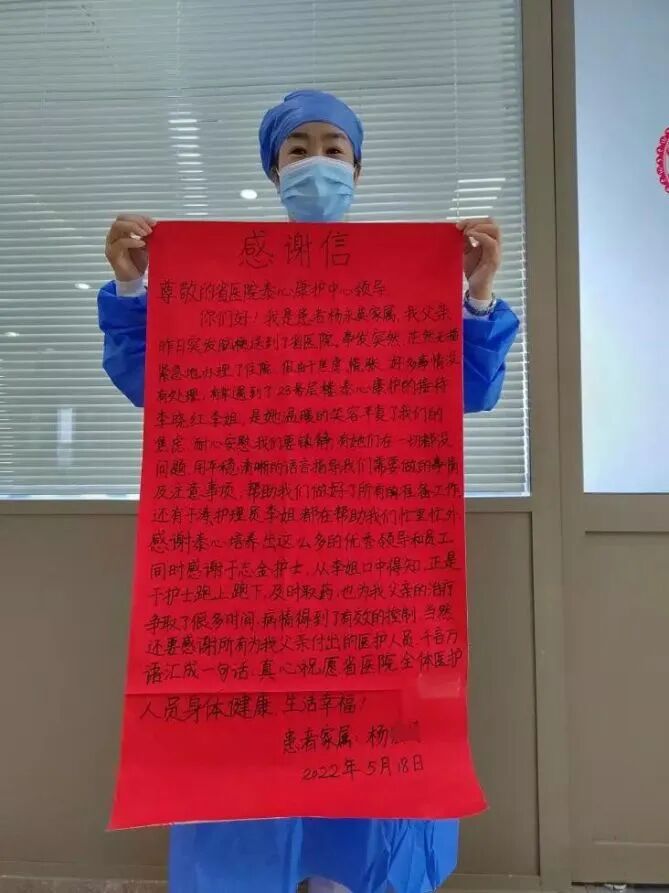 18日一早,家屬送來一張很“醒目”的感謝信,信中表達(dá)了對(duì)李曉紅的不盡感激。“是她用溫暖的笑容平復(fù)了我們的焦慮,耐心安慰我們要鎮(zhèn)靜,有她們?cè)谝磺卸紱]問題。用平穩(wěn)清晰的語言指導(dǎo)我們需要做的事及注意事項(xiàng),幫助我們做好了所有的準(zhǔn)備工作。”
