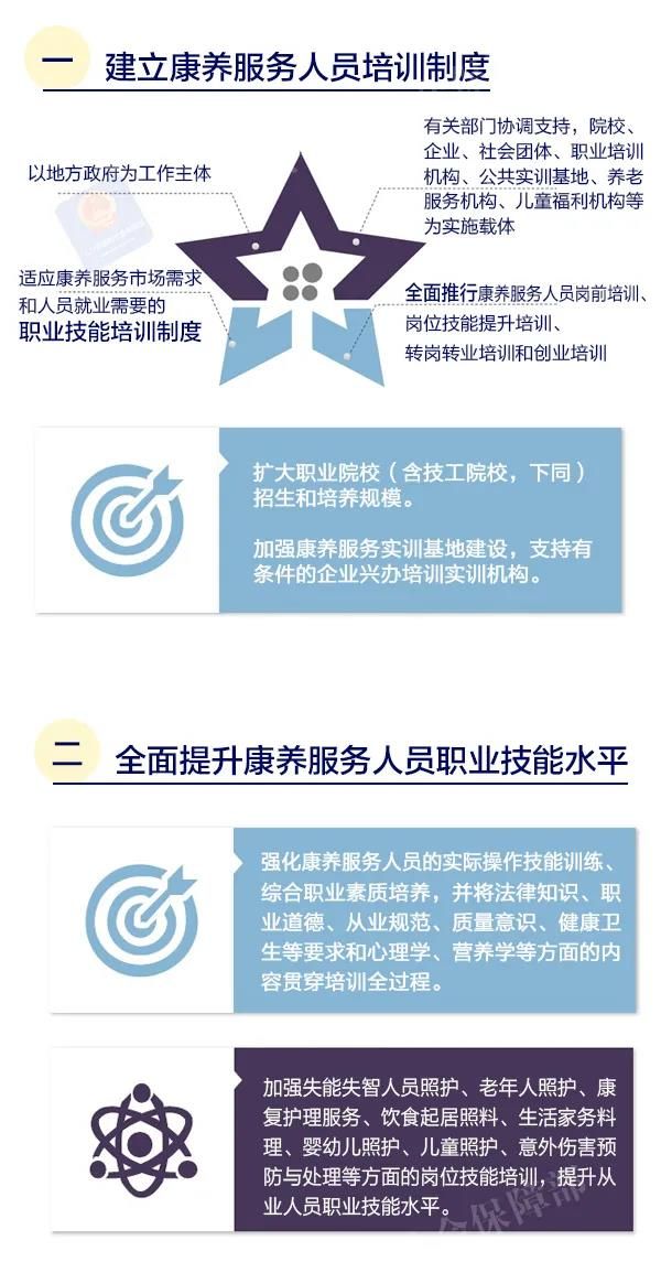 “康養(yǎng)計(jì)劃”在健全康養(yǎng)服務(wù)人員培訓(xùn)體系方面出臺(tái)了一整套“組合拳”措施。包括,建立康養(yǎng)服務(wù)人員培訓(xùn)制度;全面提升康養(yǎng)服務(wù)人員職業(yè)技能水平;健全康養(yǎng)服務(wù)培訓(xùn)標(biāo)準(zhǔn)體系;大力培育康養(yǎng)服務(wù)企業(yè)和培訓(xùn)機(jī)構(gòu)等。