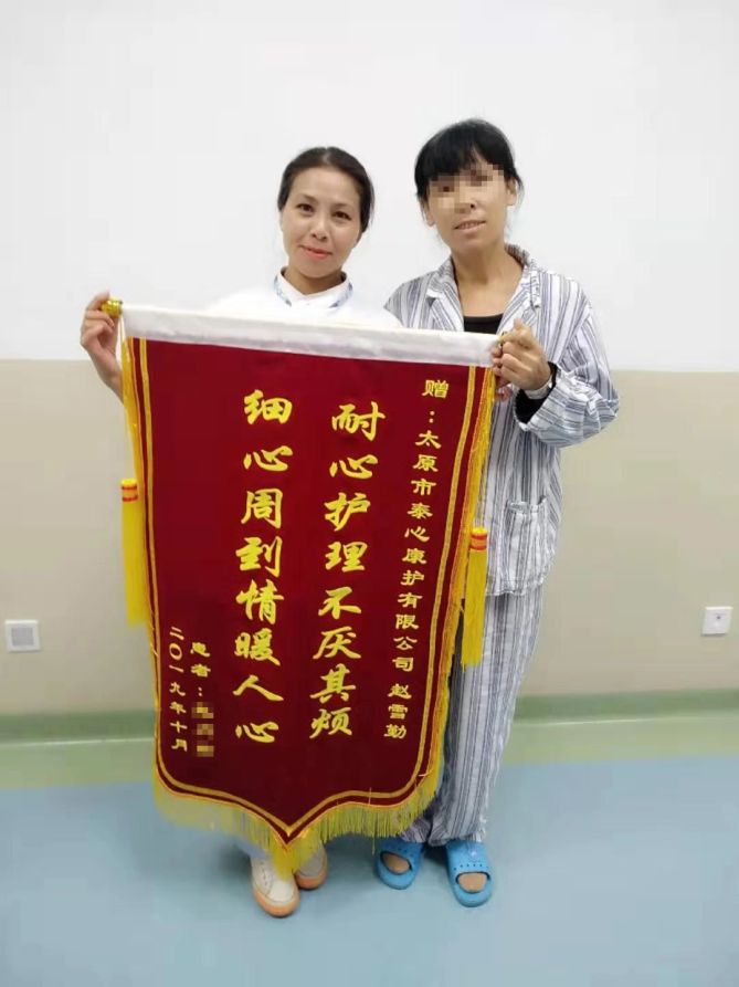 第二天上午,老魏兒子與朋友急匆匆趕到泰心康護(hù)山西省人民醫(yī)院項(xiàng)目辦公室,將一面題有“愛心耐心,心細(xì)患者,認(rèn)真負(fù)責(zé)勝似親人”的錦旗遞給項(xiàng)目主管,拉住主管的手連忙感謝道“我老父親全靠你們照顧了,今天還要趕航班,再次感謝泰心康護(hù)的工作人員。尤其是大劉、小冀,你們辛苦了,這面錦旗送給你們,以表達(dá)我們?nèi)业母屑ぶ椋?/span>請一定要收下這份榮譽(yù)!”
