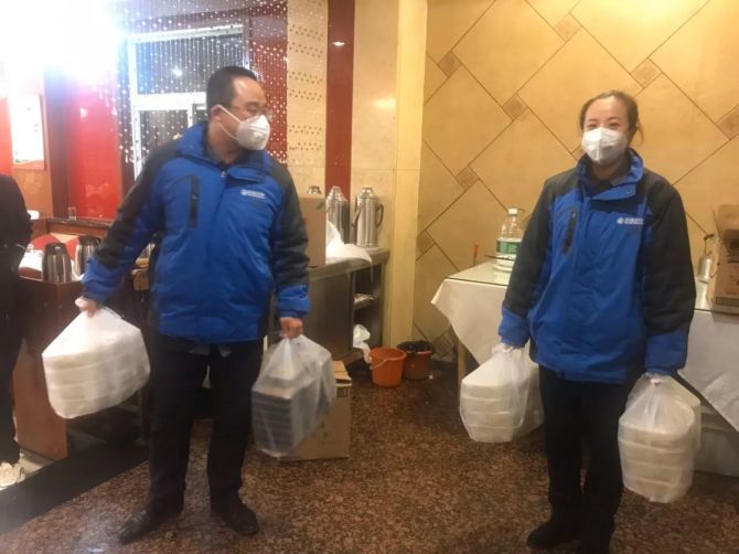 △大年三十,項目主管丁曉東(左一)為護理員送上可口的飯菜