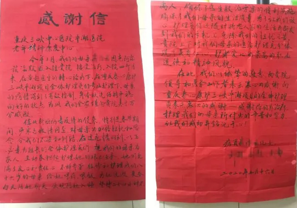 “泰心康護小組式護理員不僅護理技術精湛,而且服務態(tài)度也十分好,這4個多月以來治療護理我們的母親付出的辛苦和努力,讓我們感動并銘記于心”。因蔣奶奶的子女們遠在成都,便專程手寫表揚信并郵寄到泰心康護重慶市三峽中心醫(yī)院項目患者服務中心,這封感謝信傳遞著濃濃的護患情誼。