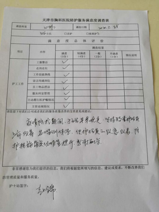 心外二科護(hù)士長趙錦在“陪護(hù)服務(wù)滿意度調(diào)查表”中對護(hù)理員工服整潔、工作技能熟練、語言溝通到位、服從科室管理等8個方面均滿分評價,并在“服務(wù)質(zhì)量改善的意見或建議”一欄中寫到:“疫情防控期間,于主管早來晚走,堅持督查護(hù)理員上崗質(zhì)量,每日檢測體溫,使護(hù)理員的儀容儀表、防控措施落實(shí)均明顯提升,感謝配合。”短短的幾句話,不僅是對泰心康護(hù)天津胸科醫(yī)院項(xiàng)目主管于潤芳的認(rèn)可,更是對我們天津市胸科醫(yī)院項(xiàng)目團(tuán)隊(duì)肯定與鼓勵!