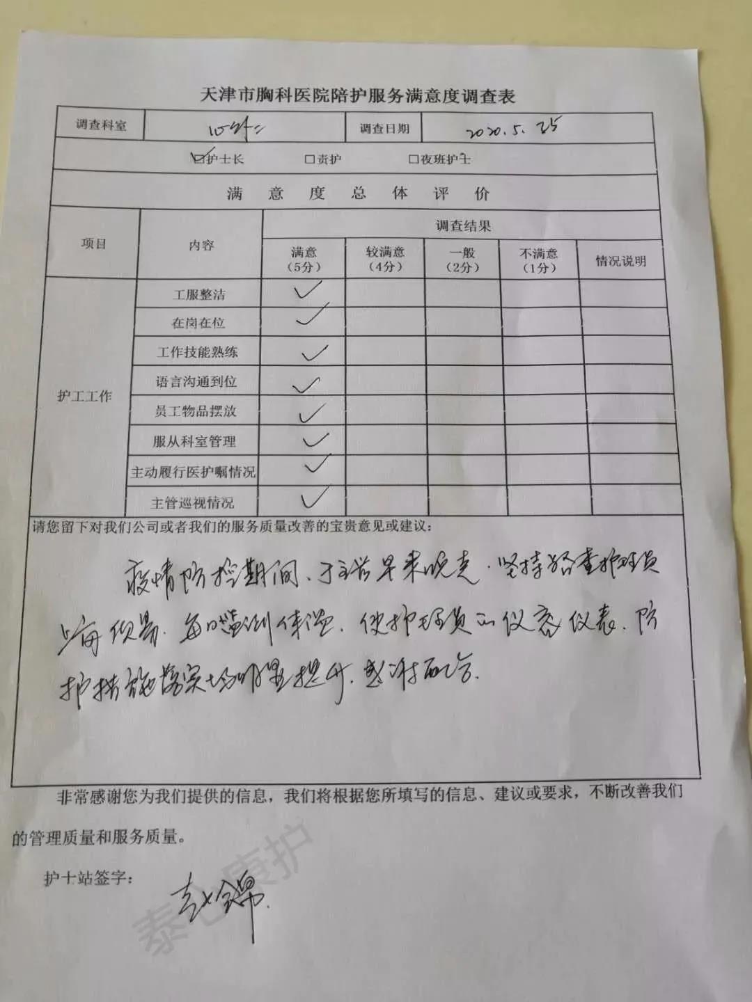 心外二科護士長趙錦在“陪護服務(wù)滿意度調(diào)查表”中對護理員工服整潔、工作技能熟練、語言溝通到位、服從科室管理等8個方面均滿分評價,并在“服務(wù)質(zhì)量改善的意見或建議”一欄中寫到:“疫情防控期間,于潤芳主管早來晚走,堅持督查護理員上崗質(zhì)量,每日檢測體溫,使護理員的儀容儀表、防控措施落實均明顯提升,感謝配合。”短短的幾句話,不僅是對泰心康護天津胸科醫(yī)院項目主管于潤芳的認可,更是對我們天津市胸科醫(yī)院項目團隊肯定與鼓勵!