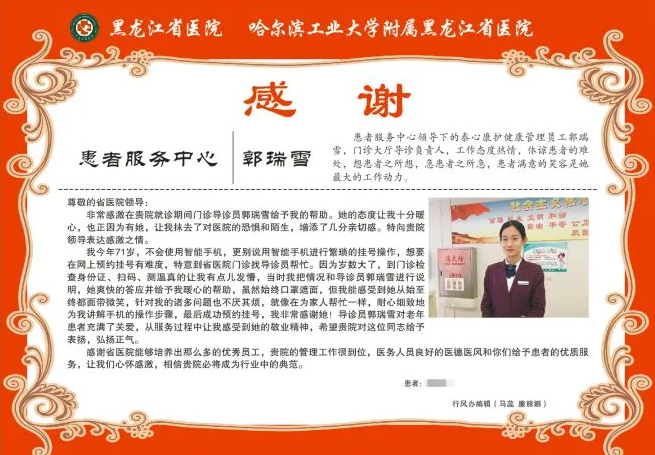 2020年2月起,黑龍江省醫(yī)院響應(yīng)省里要求,患者及家屬就診必須掃龍江健康碼,填寫網(wǎng)上醫(yī)院的就診信息,這可難壞了年齡較大的患者,郭瑞雪和她的導(dǎo)診姐妹們,每天手把手的幫助患者及家屬掛號、付款等操作,耐心細(xì)致的服務(wù),得到了廣大患者的高度贊譽(yù)。