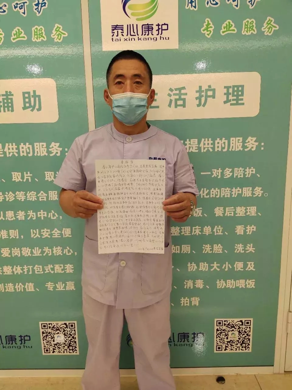 家屬在感謝信中寫(xiě)到:“徐春有奮力把我弟弟給拽了回來(lái),讓我們完整的家避免了一場(chǎng)悲劇,我們?nèi)曳浅8兄x徐春有,更要感謝貴公司領(lǐng)導(dǎo)教導(dǎo)有方,培育出這么優(yōu)秀的護(hù)理員。是你們給了我弟弟重生的機(jī)會(huì),在此,我們?nèi)疑钌罡屑!泰心康護(hù),一個(gè)響亮又有愛(ài)心的名字,我們會(huì)永遠(yuǎn)記在心里!”
