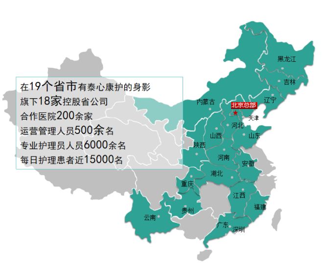 歷時五年,泰心康護速成長為北方康護市場領(lǐng)軍企業(yè),旗下18家控股公司,500余名運營管理人員、6000余名專業(yè)護理人員,服務(wù)全國19個省份200余家醫(yī)院。