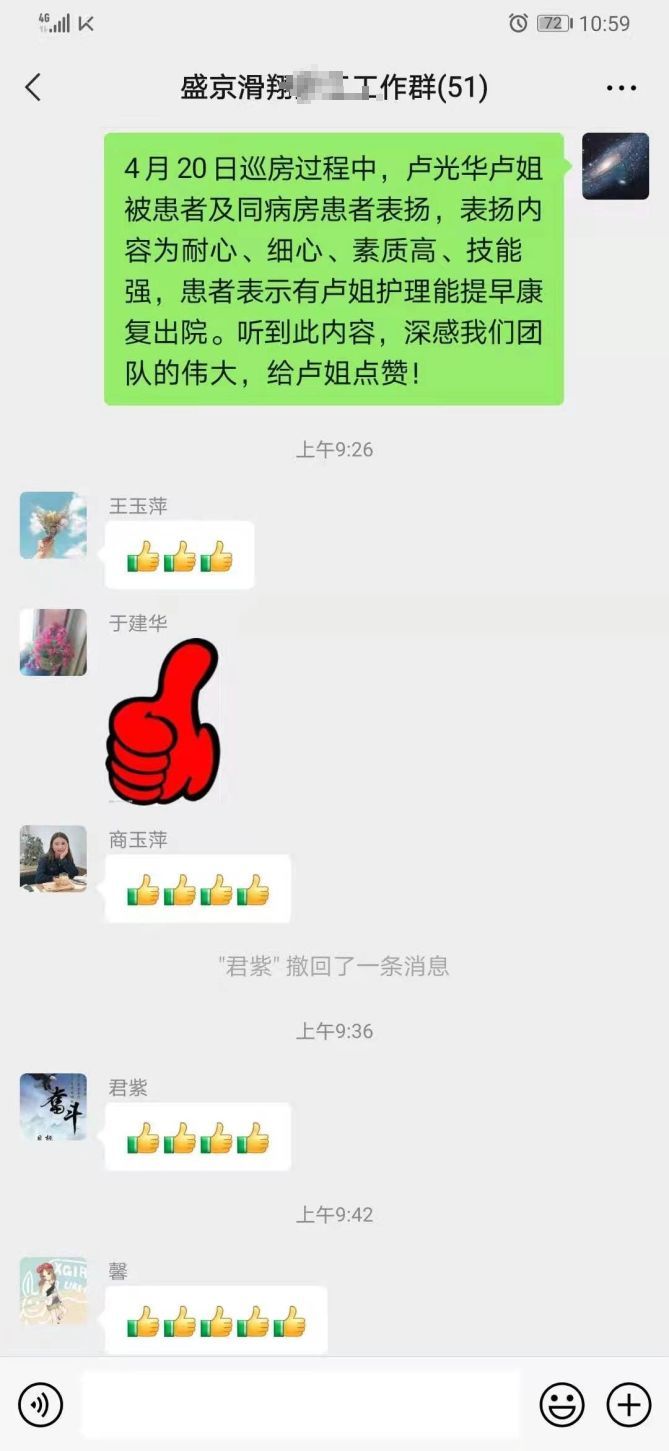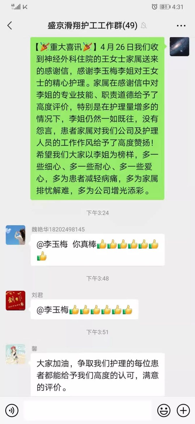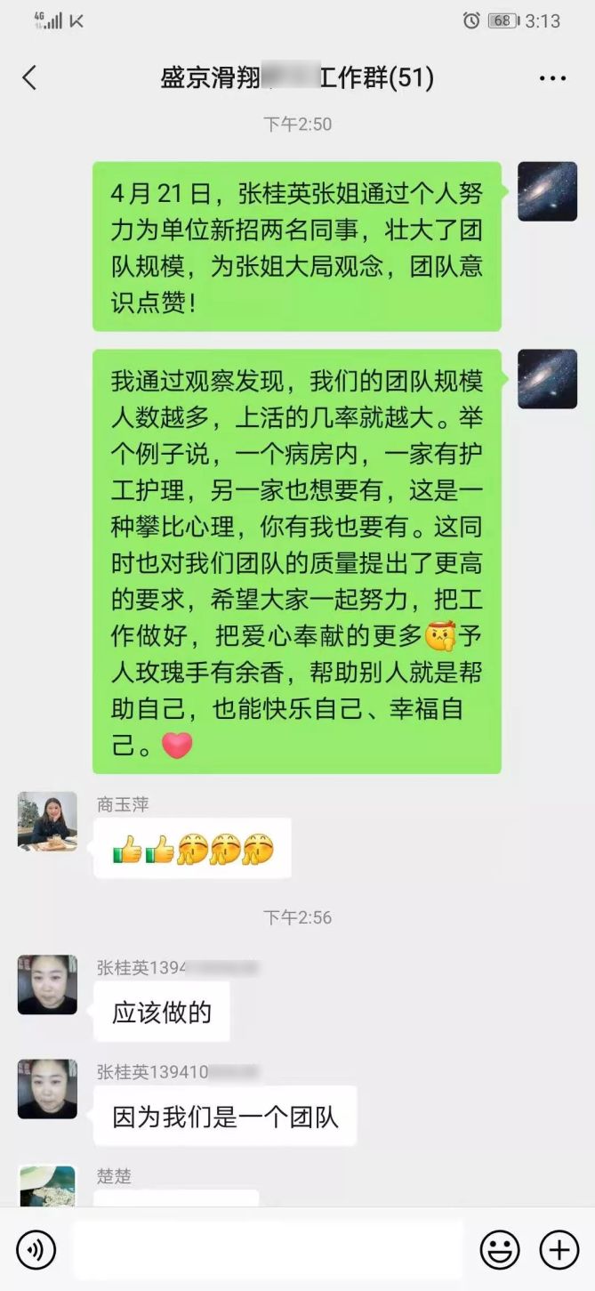 在微信群中我們開展“微表揚”活動,就是將工作中的好人好事報道出來,鼓勵優(yōu)秀護理員,讓大家去學習效仿,形成良性的“比學趕幫超”氛圍。