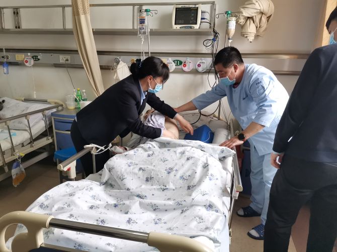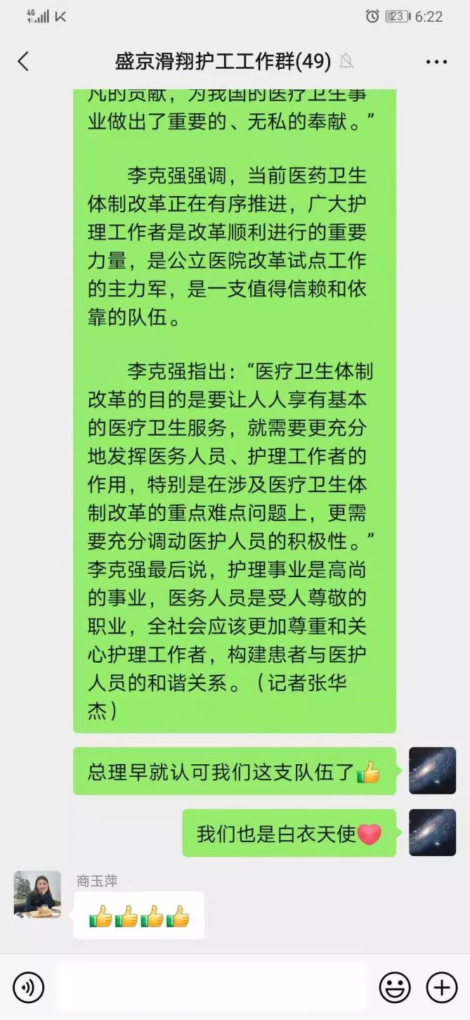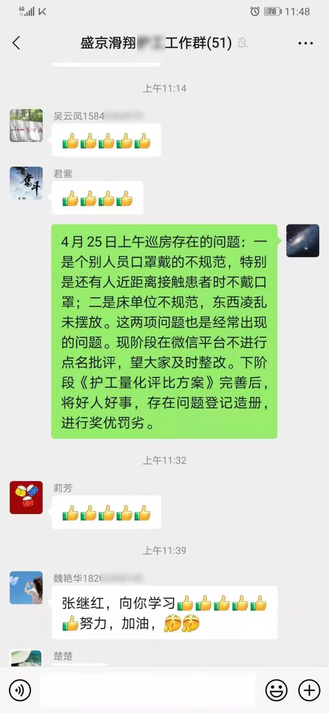 護理員魏姐和張哥兩人是夫妻,也是同事。魏姐看到丈夫在微信群上被表揚,無比自豪也評論勉勵自己說:向張繼紅學習!努力、加油!