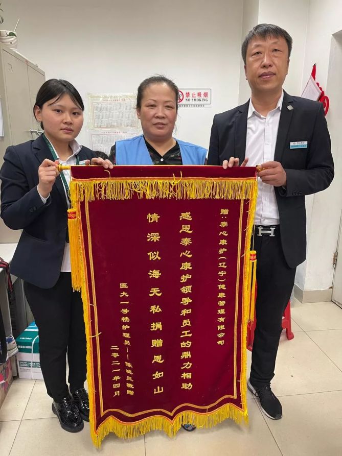 2021年4月30日,泰心康護護理員陳曉鳳將一面題有“感恩泰心康護領導和員工的鼎力相助,情深似海無私捐贈恩如山”字樣的錦旗送到了中國醫(yī)大一院患者服務中心,她用28字加長版錦旗衷心的感謝泰心康護全體同仁雪中送炭,通過大家的幫助使自己重新燃起了對生活的信心和希望,泰心康護真是個情暖人間的大家庭!