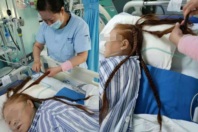 在照顧患者期間,我們發(fā)現(xiàn)她很喜歡自己的一頭長發(fā),不舍得剪也沒精力打理,還時(shí)常和我們說頭皮不太舒服。發(fā)現(xiàn)這一情況后,我們團(tuán)隊(duì)與經(jīng)理和醫(yī)護(hù)人員溝通,想為臥床的阿姨洗頭,然后編辮子。得到醫(yī)護(hù)人員和患者的同意后,我們就開始行動(dòng)。編好辮子后,患者說:“你們團(tuán)隊(duì)真棒,照護(hù)患者任勞任怨,有責(zé)任有擔(dān)當(dāng),還這么有才華,這辮子越看越喜歡。”
