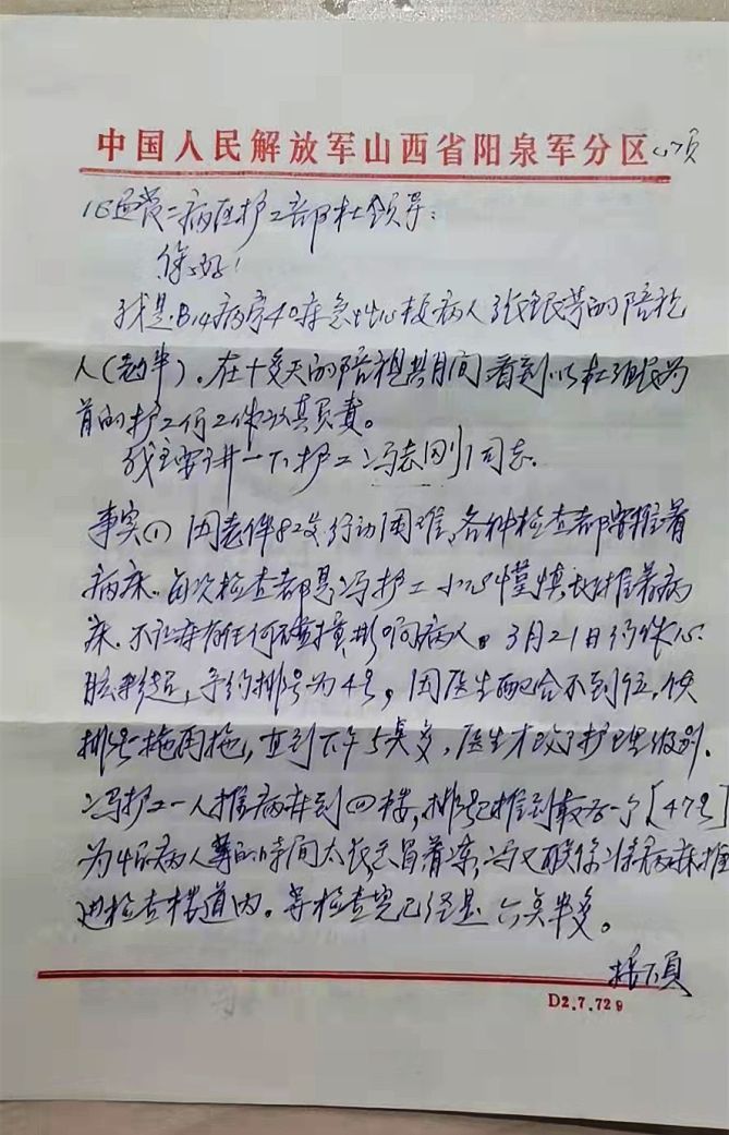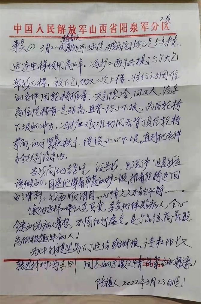 老人的字蒼勁有力,信中寫到:“老伴今年82歲了,因急性心梗入院,住院期間行動困難,各種檢查都要推病床去做,每次檢查都是馮護理員小心謹慎地推著病床,不讓床有任何碰撞,以免影響其他病人。在預約做心臟彩超時,因為患者人數(shù)多,排不上隊,馮護理員為了早一點能讓老伴做上心臟彩超,一個人提前推著病床下樓排號,終于排上號了,但是是最后一個,他擔心老伴等的時間長會感冒,將病床推到檢查樓道內(nèi),直到傍晚六點多檢查完后,他又急忙將老伴推回病房。”