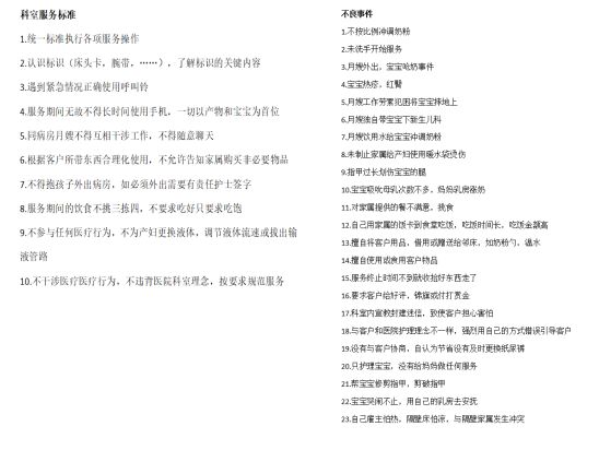 包括月嫂績效考核制度,從儀容儀表、服務(wù)禮儀、服務(wù)規(guī)范、不良事件四個方面進行培訓(xùn)管理。