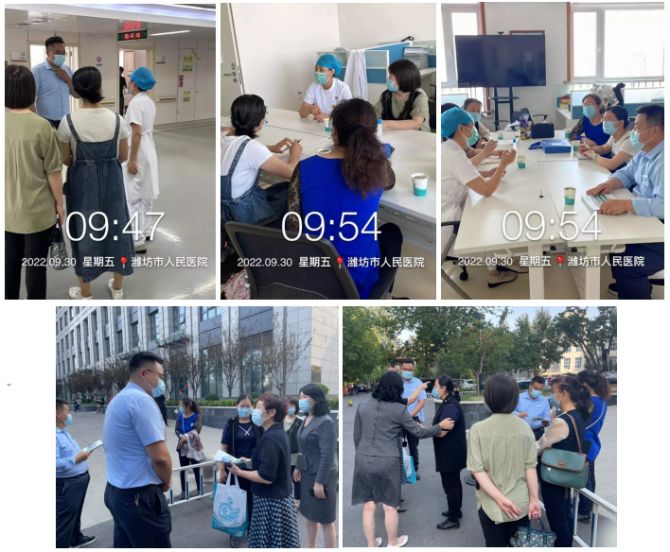 2022年9月30日,濰坊市昌樂縣人民醫(yī)院孟曉瑩主席、周雪梅主任一行六人到濰坊市人民醫(yī)院就醫(yī)院護理服務支持項目進行參觀考察,濰坊市人民醫(yī)院護理部主任秦德春、濰坊市人民醫(yī)院病患服務中心負責人蘇登科進行接待講解。此行重點對脊柱外科一區(qū)、關節(jié)外科一區(qū)、心內科二區(qū)、急診監(jiān)護室科室進行交流和參觀。