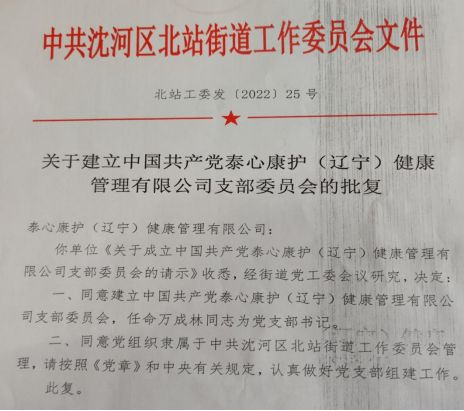 2022年8月22日上午,泰心康護(hù)(遼寧)健康管理有限公司收到中共沈河區(qū)北站街道工作委員會批復(fù)成立黨支部的批復(fù),這是對泰心康護(hù)(遼寧)健康管理有限公司的一種肯定,也寄予了泰心康護(hù)(遼寧)健康管理有限公司在今后發(fā)展中更加堅(jiān)定的信念。