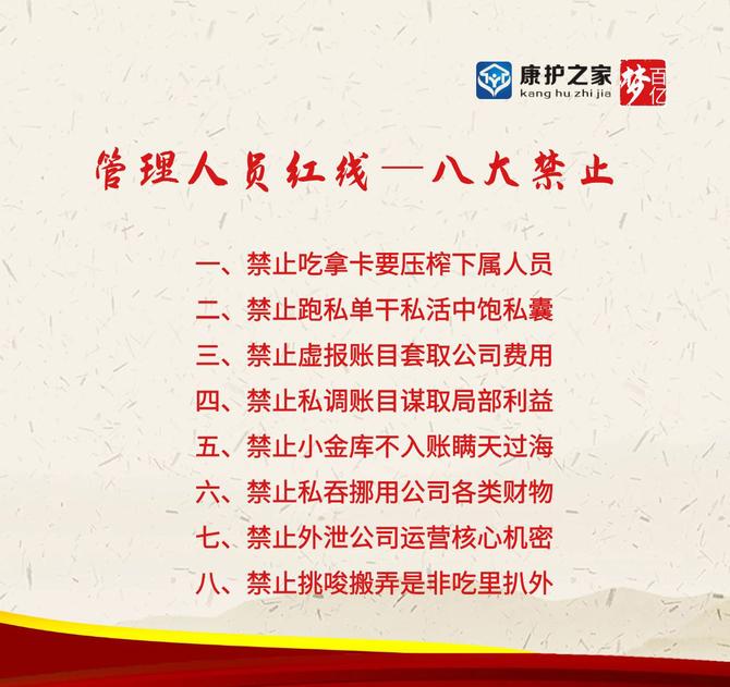 強化管理人員廉潔自律意識,筑牢拒腐防變、廉潔從業(yè)的思想防線。自康護之家監(jiān)察部組織召開以“反貪腐、提倡廉、強管理、促經(jīng)營、奔百億”為主題的警示教育大會以來,集團管理人員紛紛表態(tài),深入貫徹集團反腐精神“恪守廉潔紀律,嚴守8大紅線”持續(xù)營造清廉家風,堅決筑牢拒腐防變防線。
